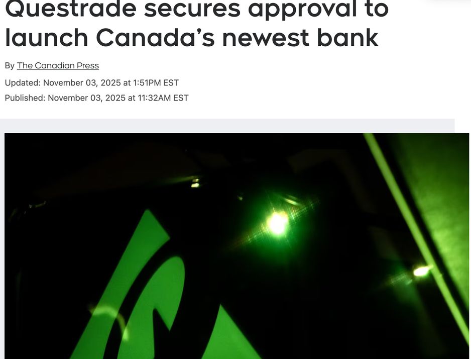 加拿大金融市场即将迎来一位新玩家。总部位于多伦多的 Questrade 金融集团近日宣布,旗下新银行 Questbank 已获得加拿大金融机构监管局(OSFI)的正式批准,成为全国最新的一家银行。Qu